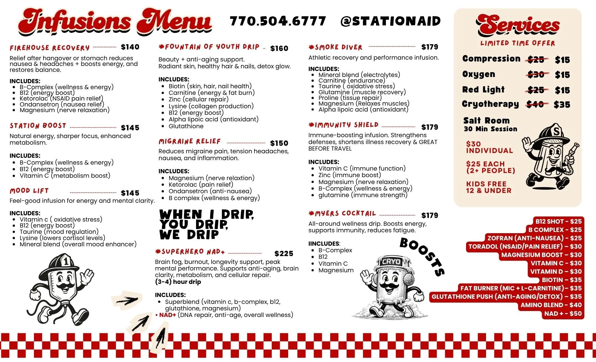 Our IV therapy, Red Light Therapy, IM Injections, Halotherapy, and Cryotherapy services are not intended to diagnose, treat, cure, or prevent any disease. Services are provided after medical screening and practitioner approval.